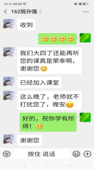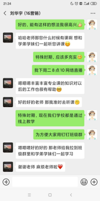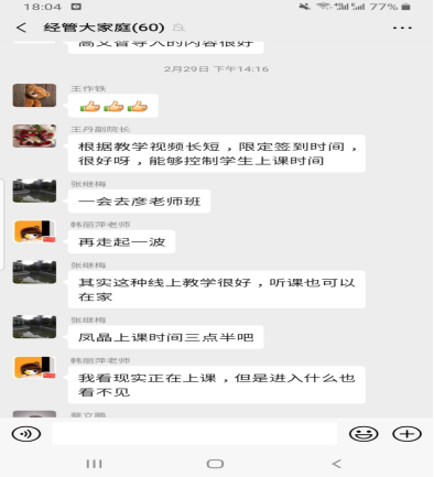 “网络在线教学,使我们这些没踏入过大学校园的家长见识到了不一样的世界。”线上授课不仅让同学们不停学,更是让家长们对学校和老师有了更深一步了解,家长们也通过线上学习,掌握新知识,丰富自己的精神世界。“商务礼仪课,这门课听着就很感兴趣,于是便安静的坐下来跟孩子一起听课,真的学到了很多新知识”,2017级保险学刘继英的家长说道。