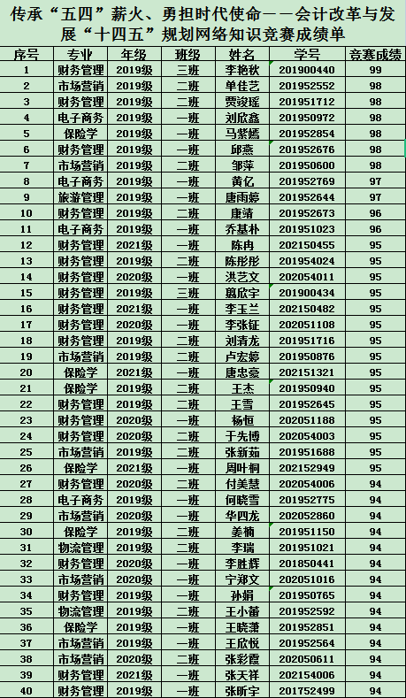 5月4日,必赢线路检测中心学工人员和专任教师两支队伍协作,依托国家财政部会计司云端竞赛平台,坚持党建与团建结合、思政与专业融合、跨学科跨专业,组织全院2019级至2021级6个专业1047名学生,开展了“传承‘五四’薪火、勇担时代使命”--会计改革与发展“十四五”规划网络知识竞赛活动,庆祝“五四青年节”,推进农产品流通专业集群建设,普及会计宏观知识。经过角逐有539人获奖,其中:90-99分有120人,80-89分有215人,70-79分有126人,60-69分有78人。财务管理、保险学、市场营销等教研室获得竞赛组织奖。