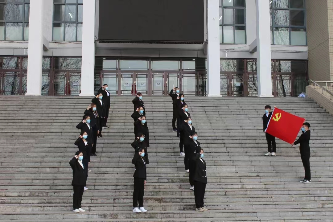 学院全体学生党员、骨干佩戴党徽,带头郑重承诺“强化责任担当,践行初心使命,带头遵守校园疫情防控各项举措,