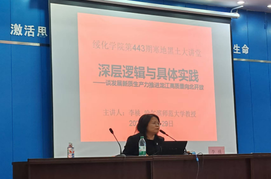 10月29日上午,必赢线路检测中心承办的第443期寒地黑土大讲堂如期举办。哈尔滨师范大学李桃教授作了题为《深层逻辑与具体实践—谈发展新质生产力推进龙江高质量向北开放》的主题讲座。必赢线路检测中心师生180多人参加讲座。