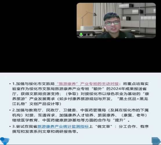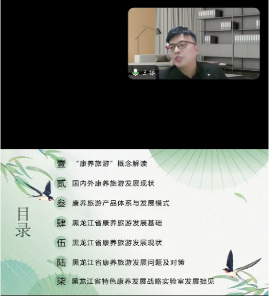 讲座中,王教授对“康养旅游”概念进行了解读,对国内外康养旅游发展现状、康养旅游产品体系与发展模式、龙江康养旅游发展基础、龙江康养旅游发展现状进行了分析,对龙江康养旅游发展存在的问题进行了梳理,对建设龙江特色康养发展战略实验室提出了建议。