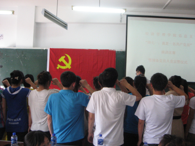 宣誓过后,新党员代表参加了“迎七一、我是一名共产党员”主题演讲比赛。在演讲环节参赛选手们从学习科学发展观的心得体会出发,讲述自己与党之间的故事。财务四班的于雪航讲述自己将如何让用实际行动把青春、知识、生命奉献给党;王建成则带领我们以中国近代史为切入点,在回顾中华民族耻辱的近现代史的同时,讲述中国共产党是引领我们走向光明的政党,只有在共产党的领导下,强国的历史使命才能得以实现,才能克服种种困难;财务管理二班的刘晓婷表示对每一个党员来说,它不仅需要豪情满怀的壮语,更需要脚踏实地的奉献,它不仅需要严于律己的品格,更需要接受群众监督的坦荡;孟凡武告诉大家从“九一八”的战火到卢沟桥事变,从南京大屠杀到皖南千古奇冤,外强内患,村村遗骨,处处狼烟时,是共产党带领我们走出困境,迎接崭新的生活。所以在党的生日到来之际,要祝贺党生日快乐。